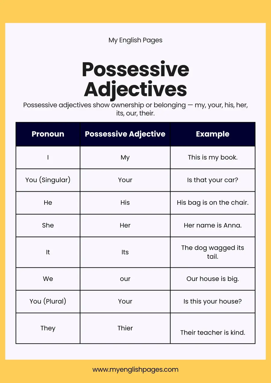 Ready to practice possessive adjectives? These free online exercises will help you learn how to use my, your, his, her, its, our, and their correctly. Perfect for beginners and ESL students — check your answers instantly and improve your grammar step by step!