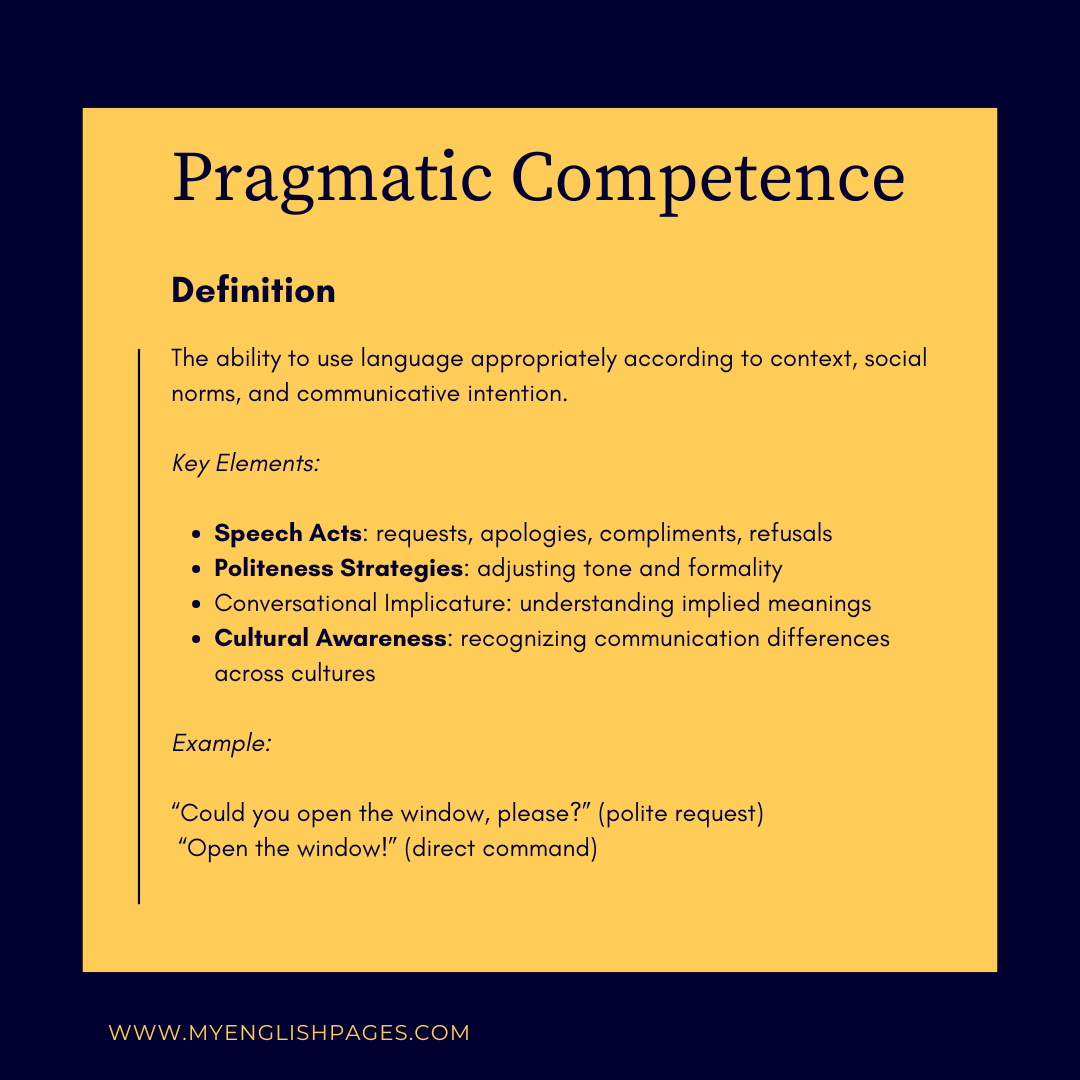 This ability is known as pragmatic competence — a crucial component of communicative competence. Developing learners’ pragmatic skills helps them sound natural, polite, and culturally appropriate when speaking English.