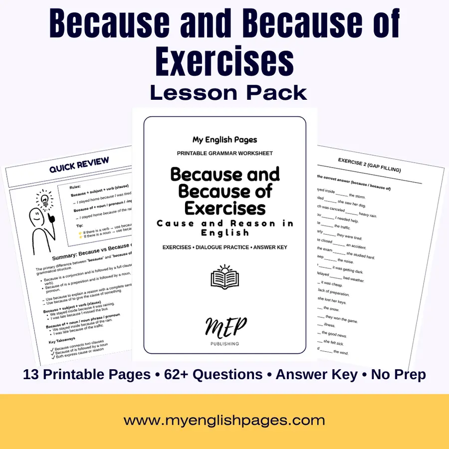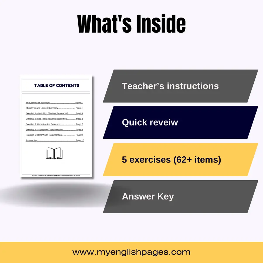 Help your students clearly understand the difference between because and because of with this ready-to-use printable worksheet pack.