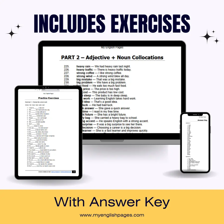 Learn 200+ essential English collocations with examples and exercises. Includes practice activities and answer key. Perfect for self-study or classroom use. Instant PDF download.