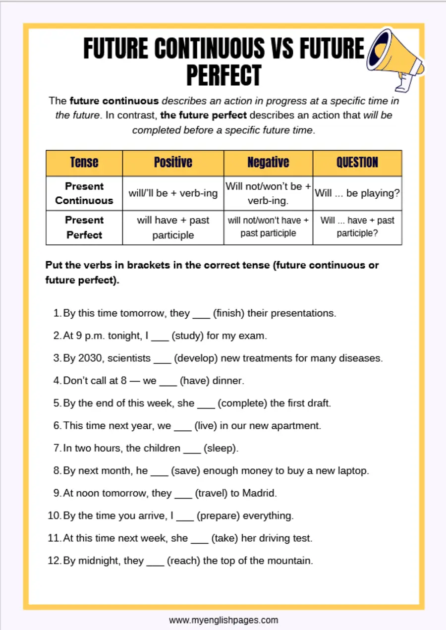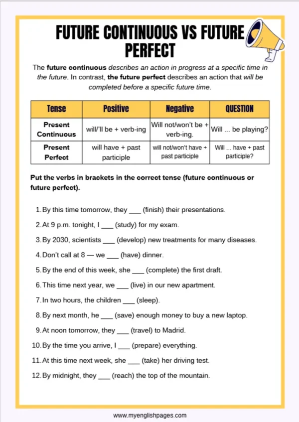 This worksheet is designed to give learners clear, focused practice with the future continuous and future perfect tenses. You can use it in several ways: