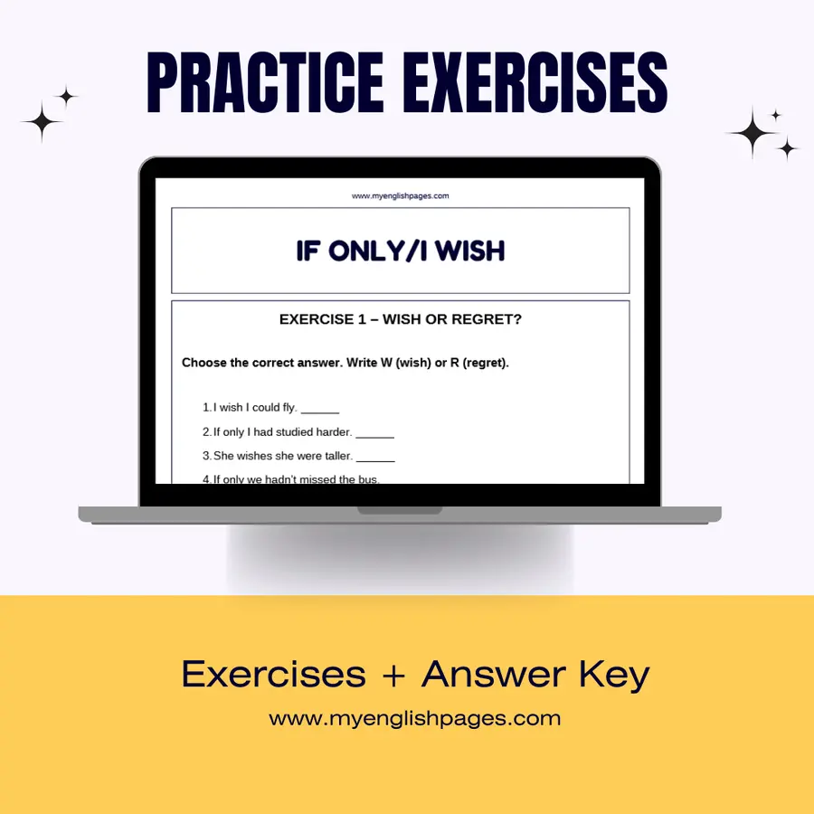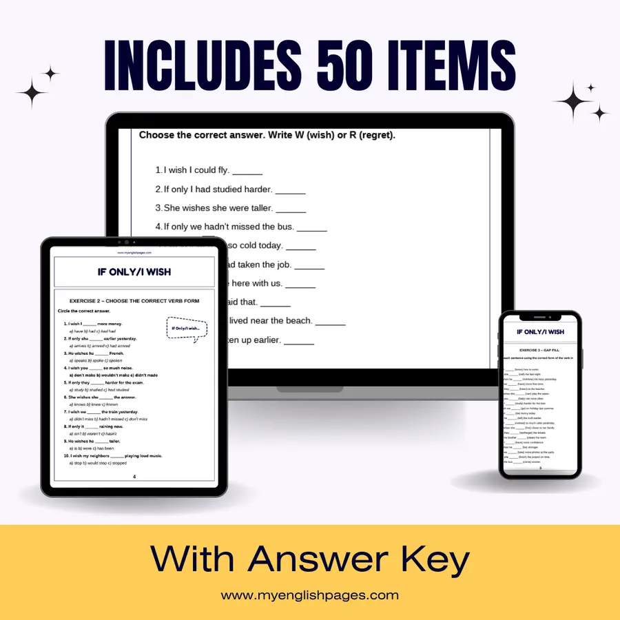 Printable I Wish & If Only worksheet with 50 practice questions and answers. Perfect for ESL/EFL students to practice wishes, regrets, verb forms, and sentence transformations. Ready-to-use PDF.