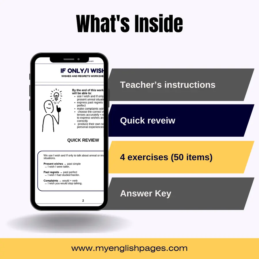 Help your students confidently use I wish and If only with this complete grammar worksheet pack designed for ESL/EFL learners.