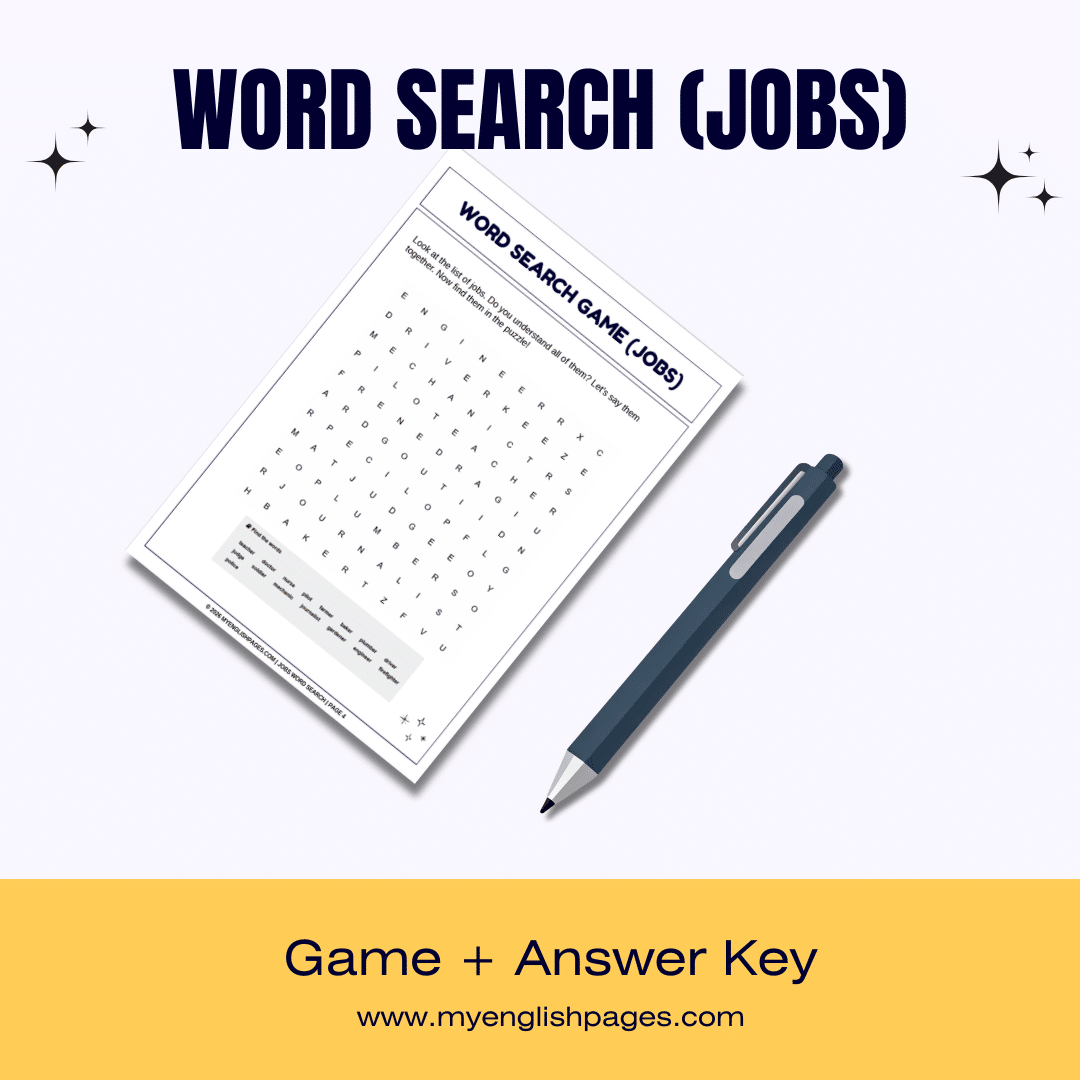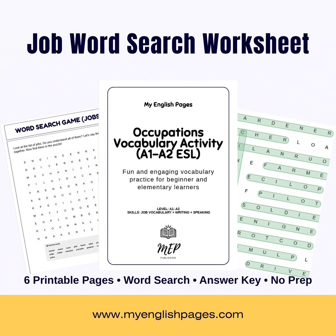This printable Jobs Word Search Worksheet is a complete ESL vocabulary resource designed for beginner and elementary learners (A1–A2).