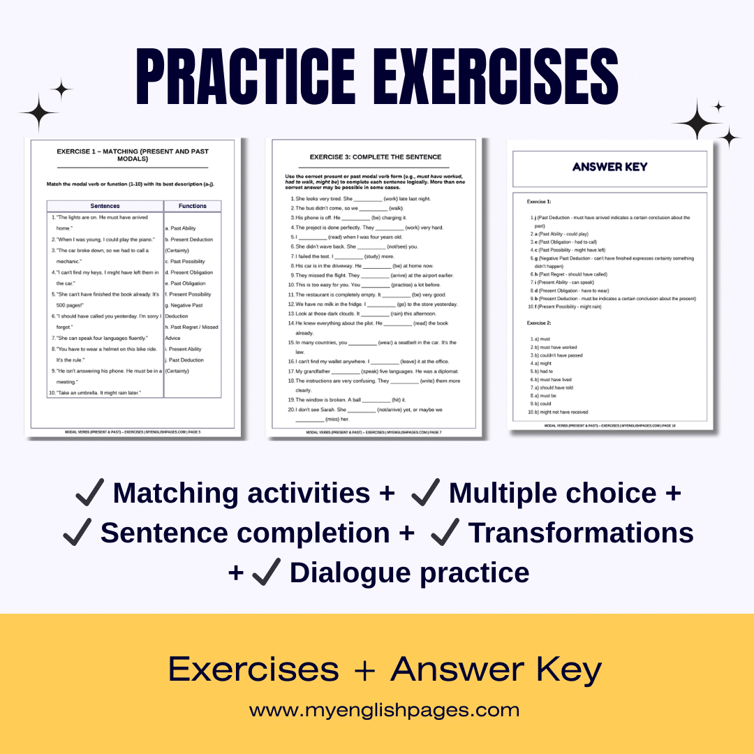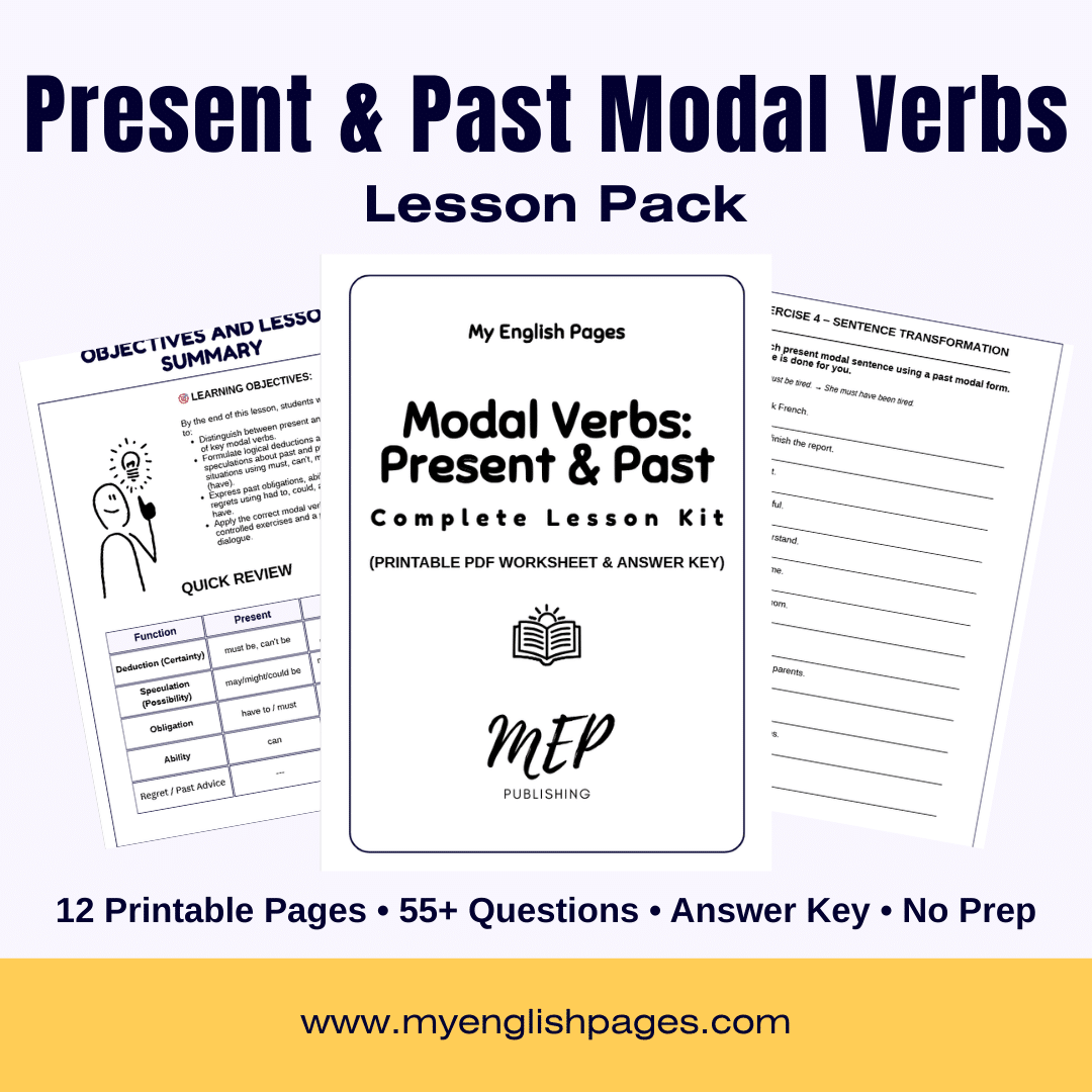 Practice present and past modals with matching, multiple choice, gap-fills, transformations, and dialogue tasks. Includes answer key. Printable PDF. Zero prep. Instant download.