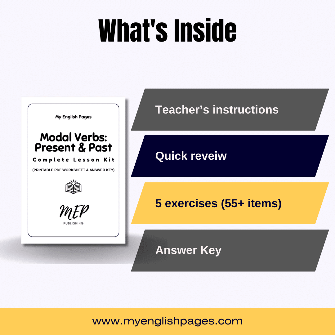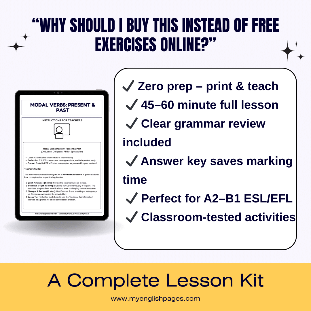 Designed for busy ESL/EFL teachers, this printable modal verbs exercises worksheet moves students from recognition to confident use in just 45–60 minutes — with zero prep for you.
