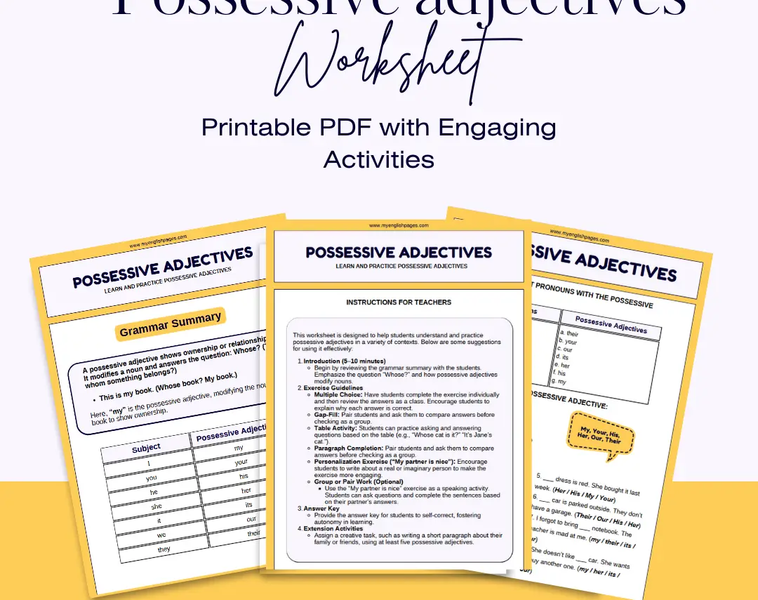 This Possessive Adjectives Worksheet PDF is the perfect resource for teaching and reinforcing possessive adjectives in a fun and engaging way.