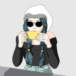 - She is enjoying a croissant and a cup of coffee